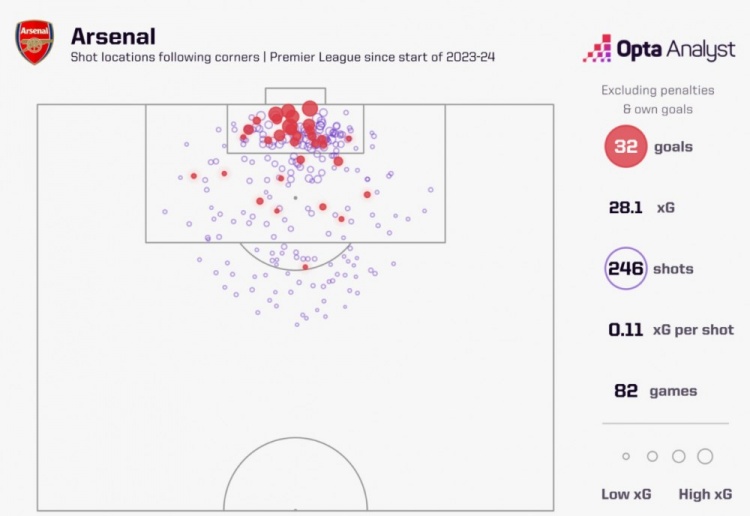 不包括乌龙球(因为没有预期进球值),阿森纳在这段时间里预期进球28.1的情况下攻入32球。仅看本赛季,阿森纳在英超中主罚了45个角球,比任何其他球队至少多4个,其中赖斯主罚了24个。这些角球产生了18次射门,其中有6次转化为进球。这意味着阿森纳在超过三分之一的角球进攻中都能形成射门,并且有三分之一的射门能够成功得分。