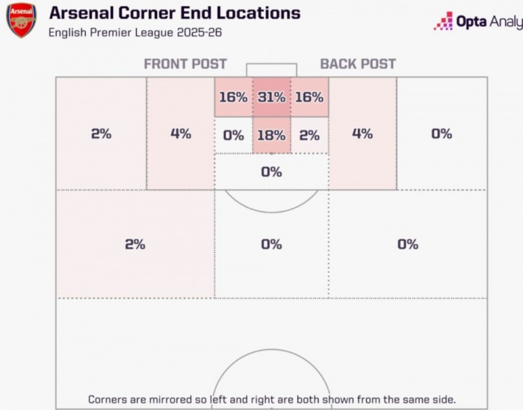 如今,阿森纳平均每场比赛都能通过角球攻入一球,这对争夺冠军来说是一个很好的方式。从下图可以看出,他们的角球战术相当丰富,几乎有一半的角球传向近门柱或远门柱,另有49%的角球传向距离球门12码内的中心区域,供身材高大的球员争顶。