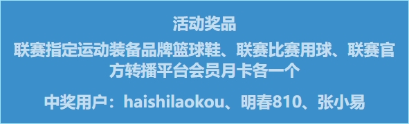 除了球员荣誉的归属,本次评选活动也为参与的吧友们带来了惊喜。经过抽奖,吧友haishilaokou、明春810、张小易成功成为本次活动的幸运儿,分别获得联赛指定运动装备品牌篮球鞋、联赛官方比赛用球以及联赛官方转播平台会员月卡的丰厚奖品。