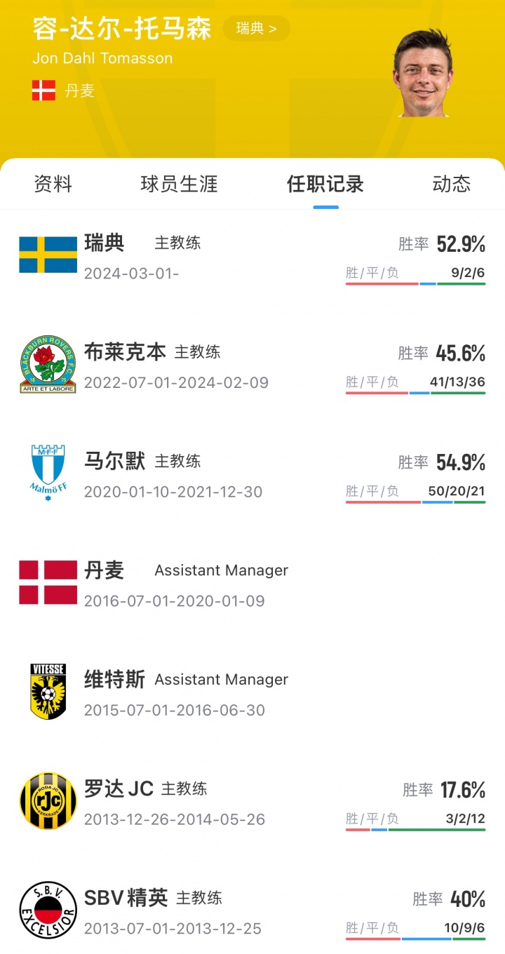 瑞典主帅托马森现年49岁,2024年3月上任瑞典主帅。他带队17场9胜2平6负。在这两个月进行的世预赛中,瑞典3负1平仅积1分小组垫底。